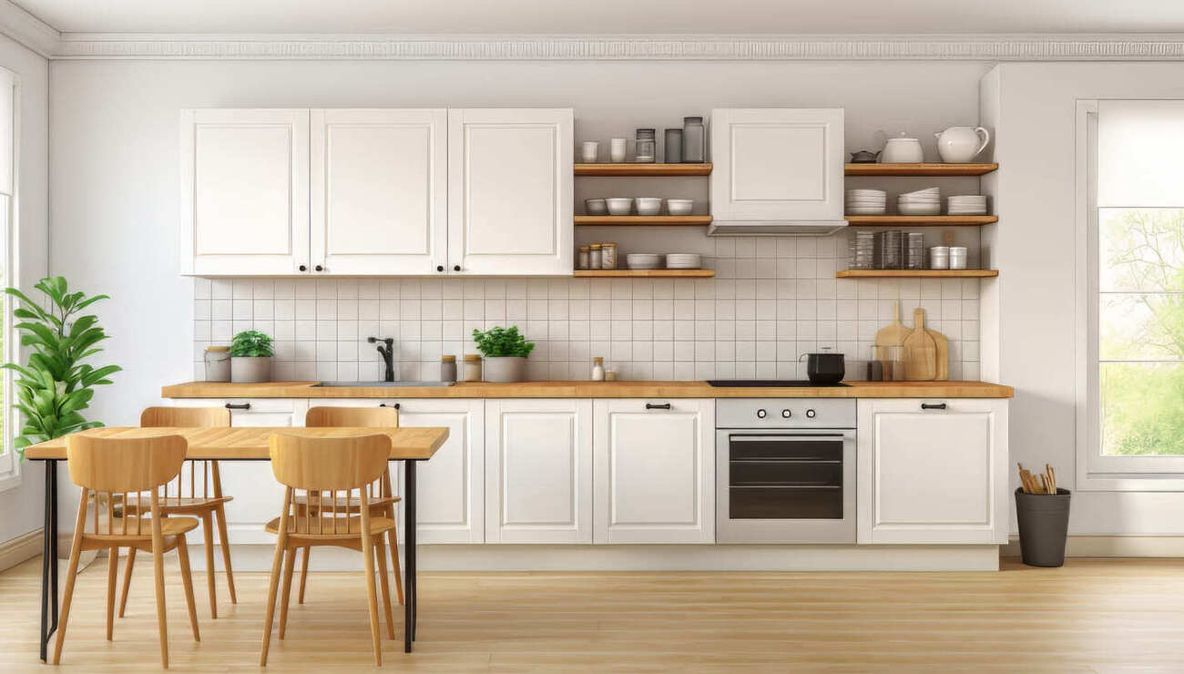 Сочетание светлого дерева и белых фасадов в дизайне кухни. Фото: freepik.com