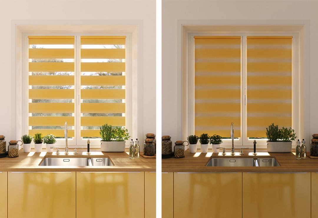 Рулонные шторы "День-Ночь" превосходно защищают от яркого света и бликов днем, а также создают невероятный уют ночью. Рулонные шторы "День-ночь" многофункциональны и имеют 2 режима использования: