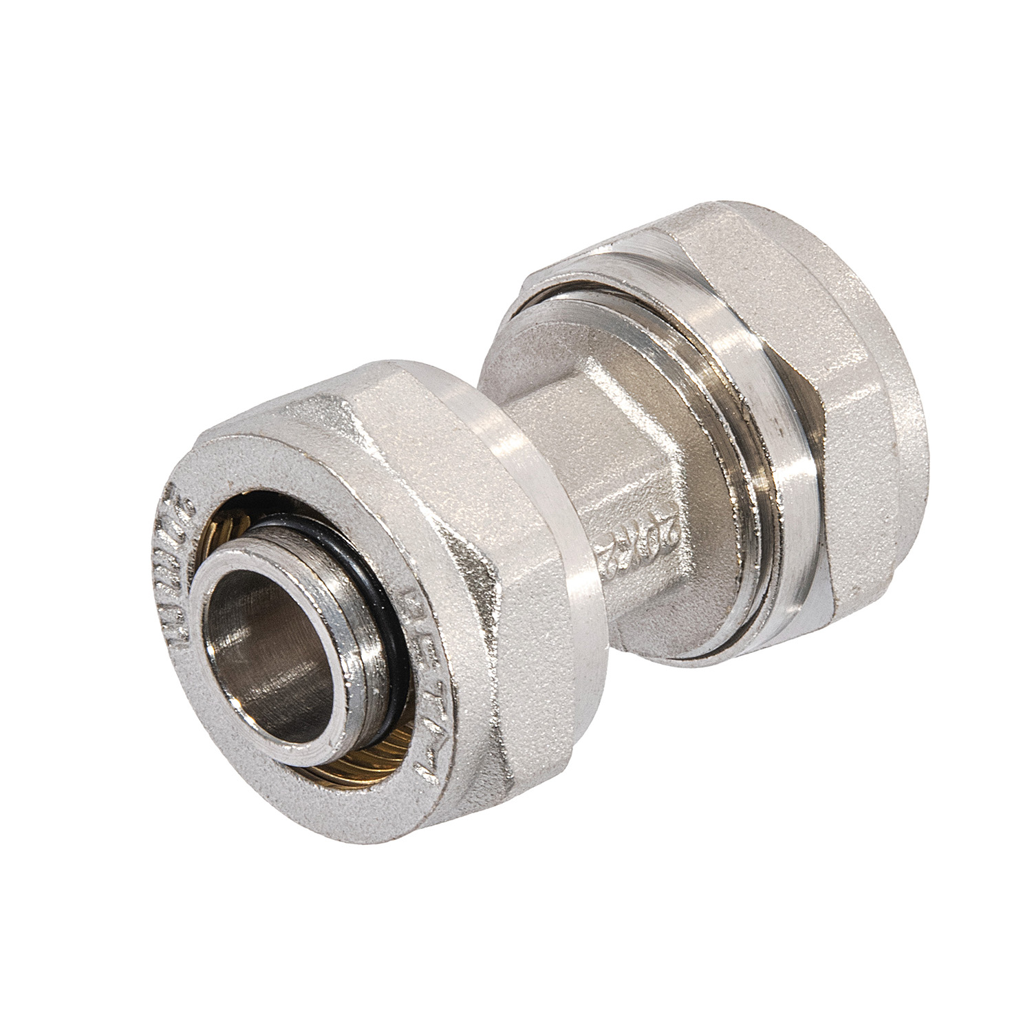 Муфта промежуточная 20х20 CTM - обжимной фитинг для соединения металлопластиковой (металлополимерной) трубы. Изготовлена методом горячей штамповки из латуни с последующей термической обработкой и никелированием для предотвращения появления коррозии, механического износа и вредного воздействия агрессивных жидкостей и воздушно-газовых сред. Корпус, накидные гайки и обжимные кольца промежуточной муфты изготовлены из латуни, уплотнительное кольцо из нетоксичной резины (EPDM), и диэлектрическая прокладка из фторопласта Ф4. Накидные гайки – усиленные.