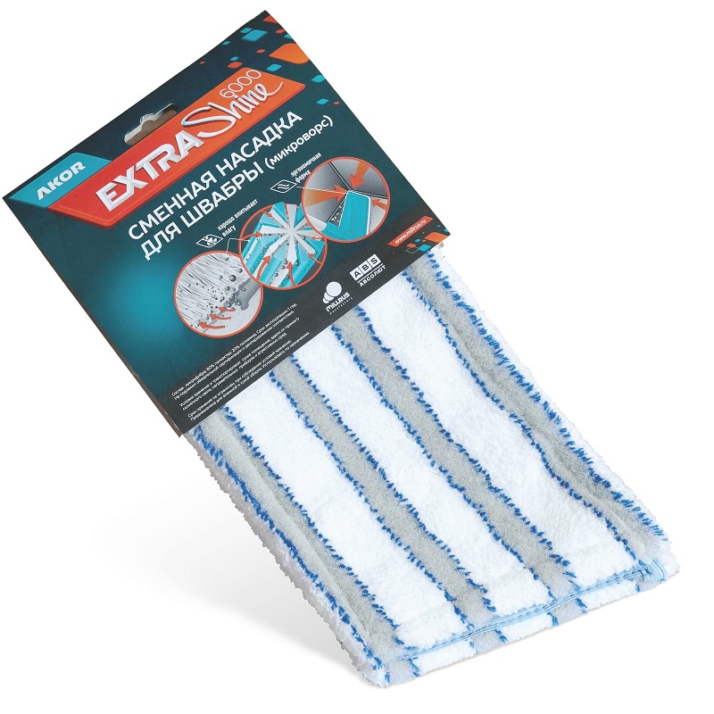 Сменная насадка для швабры ''Акор'' EXTRA-Shine 6000 микроворс. Насадка выполнена из микрофибры, из-за чего хорошо впитывает влагу. Модель хорошо скользит по полу и очищает швы, и другие структурные поверхности. Благодаря оптимальному расположению волокон обеспечивается качественная уборка.