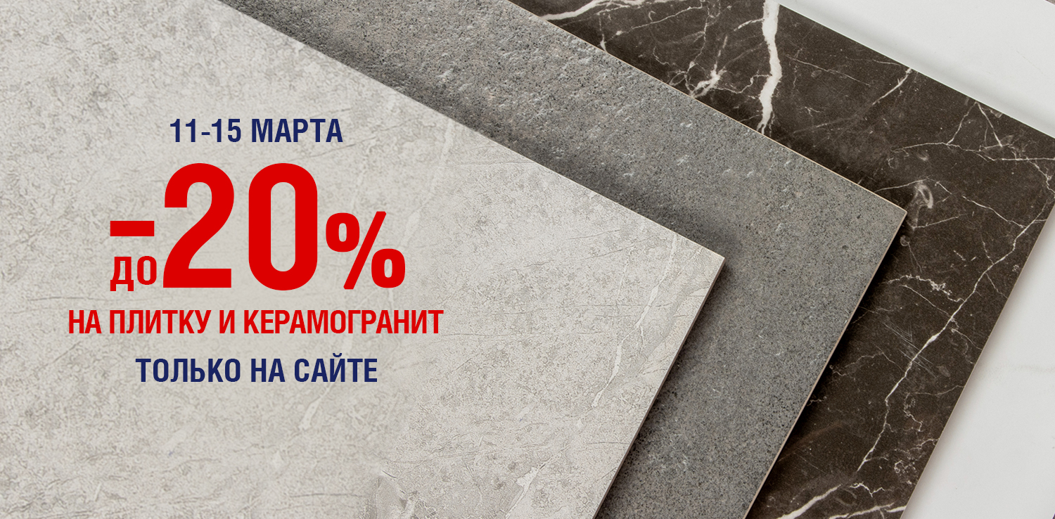 Онлайн-распродажа в сети ДомоСтрой! С 11 по 15 марта — скидка до 20% на плитку и керамогранит. Не упустите шанс обновить интерьер по выгодной цене! Стильная плитка в ванной, эффектный керамогранит на полу или яркий фартук на кухне — сделайте свой дом еще уютнее.